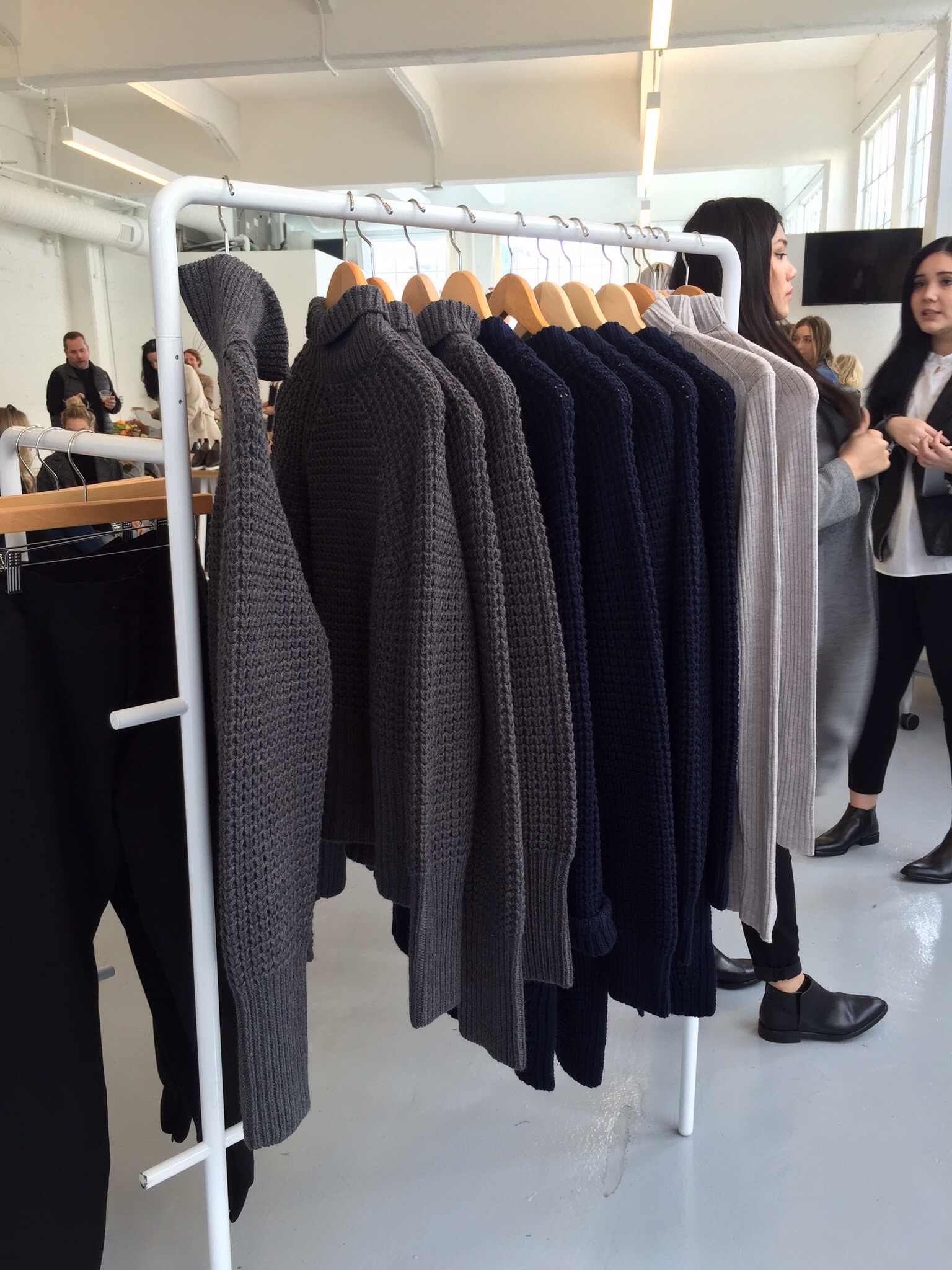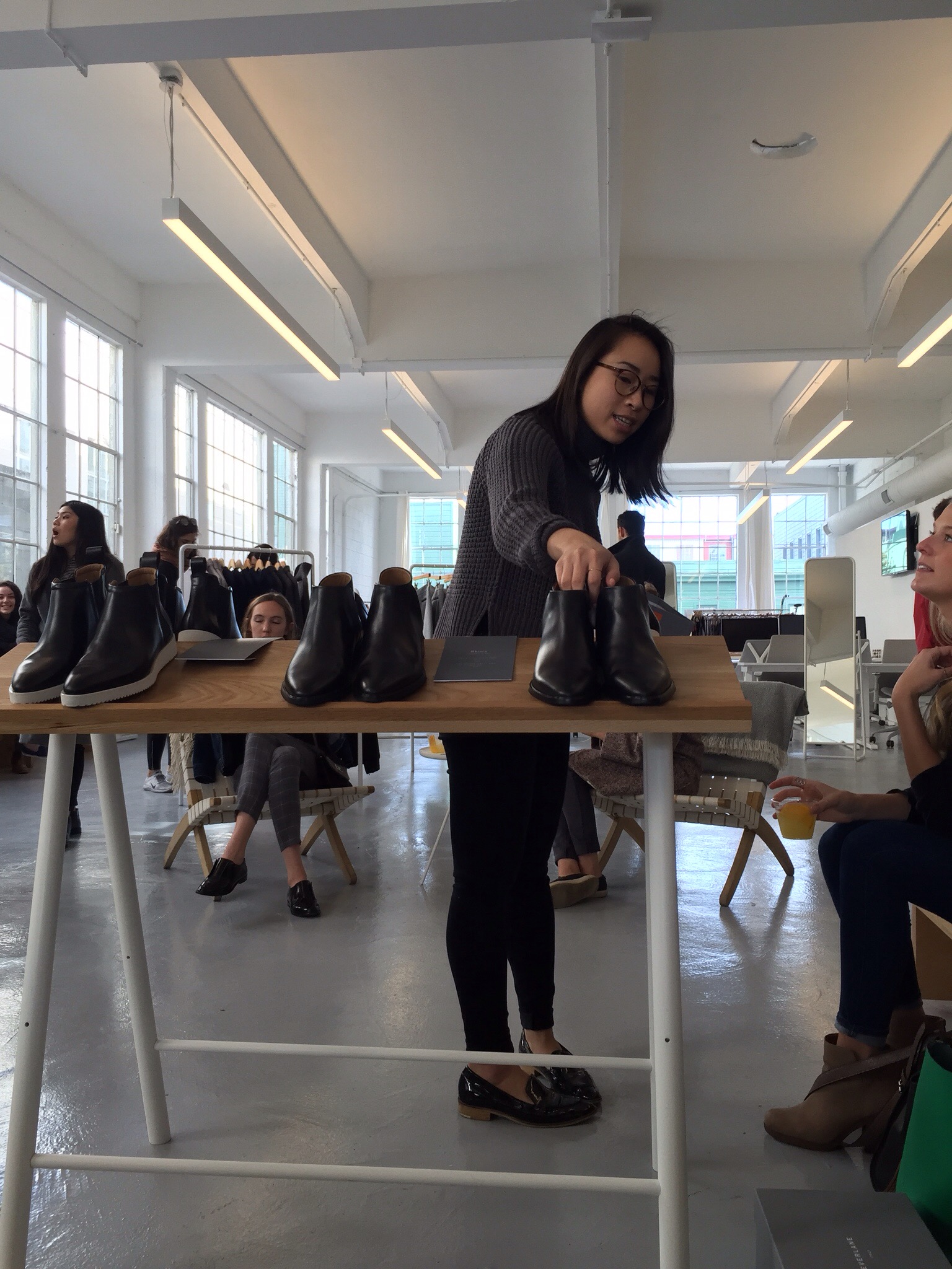 Soft beats pulsed from the DJ while fashion savvy women and men milled about siping on cocktails from Rye and trying on the yet to be released Modern and Street ankle boot collection. Also available for try-on were the Waffle Knit and Street Fleece collections. The color palette of the guests matched fittingly with the offerings on the racks; greys, blacks, whites, and navy’s. Meanwhile the only pop of color from the Everlane staff and college-aged brand ambassadors was from Ling Luke of Branding Activations and Partnerships who wore the Everlane cashmere sweater in poppy and an organza layered serenity-blue mid skirt. With her hair stylishly tucked into her turtleneck she definitely seemed like the person to talk to.