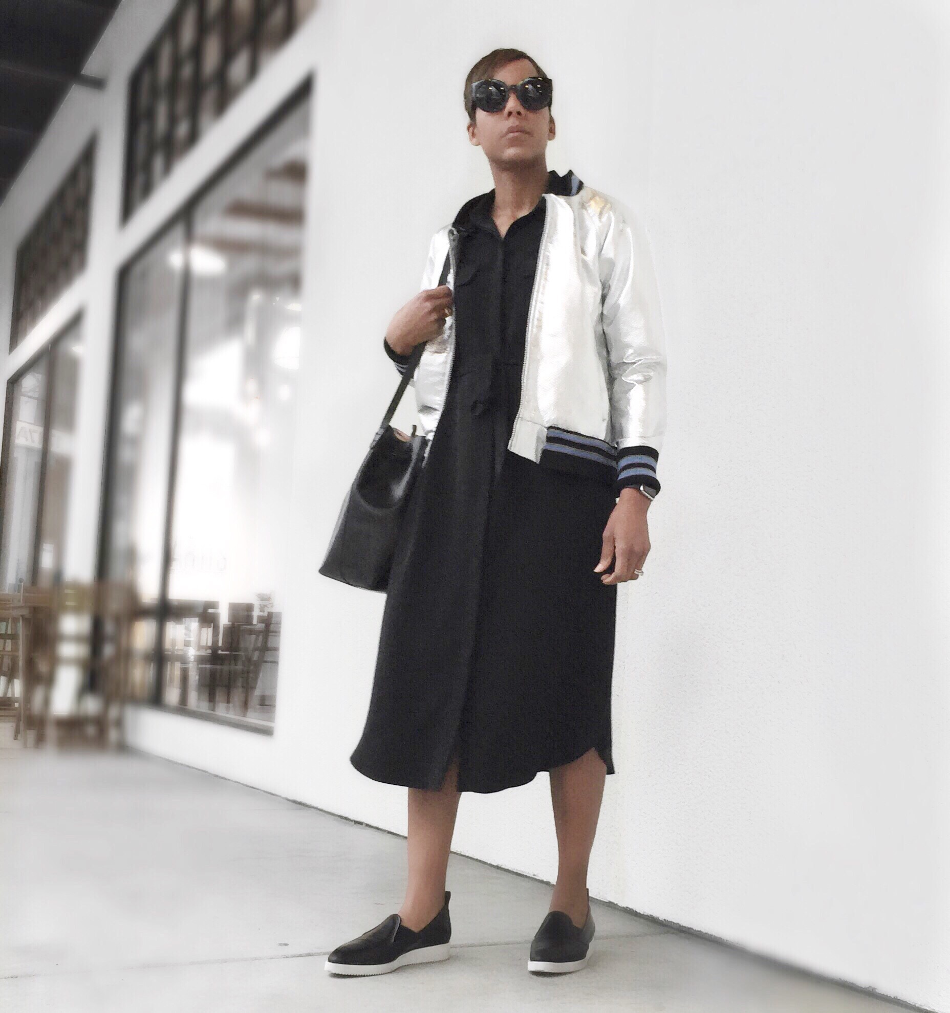 Outfit details & links: Everlane The Leather Street Shoe, Mansur Gavriel Bucket Bag, Who What Wear for Target Shirtdress , Jacket – Bloggers Own!