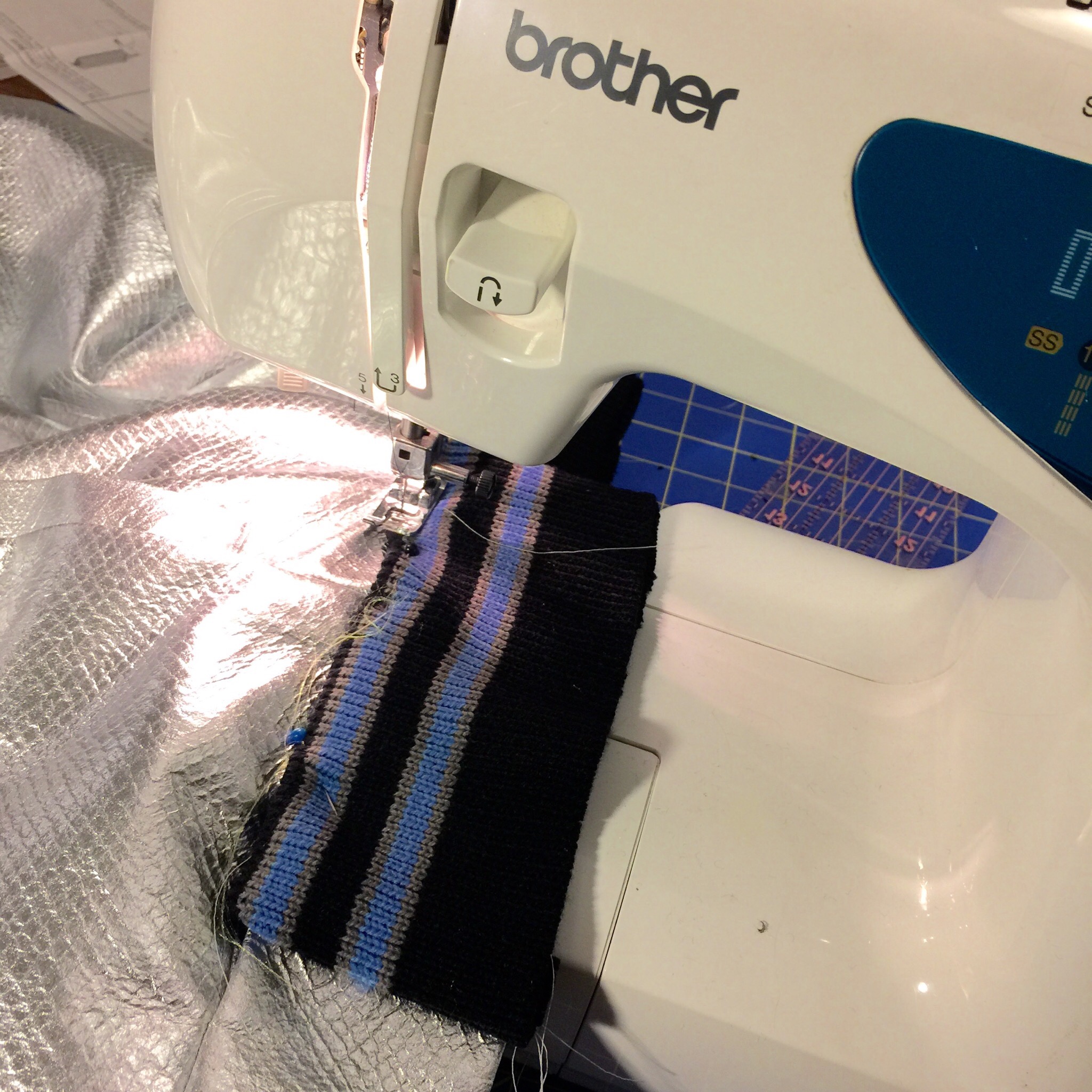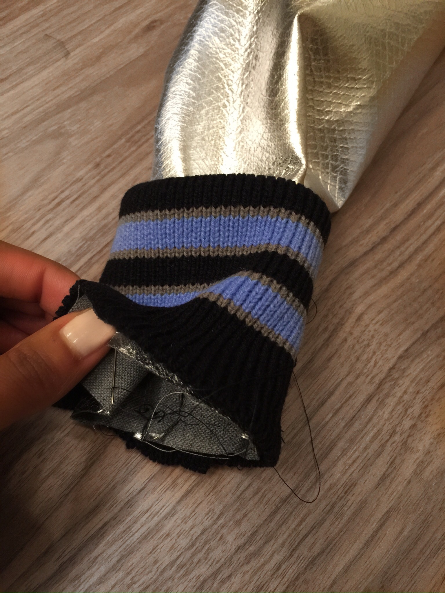All I needed was a pattern, notions, and some rib knitting and I was good to go. While this post is not a step by step tutorial, I have posted pictures of most of the process. I used pattern M7100 by McCall’s and I purchased the rib knitting for the waist, sleeves, and neck bands from Discount Fabrics.
