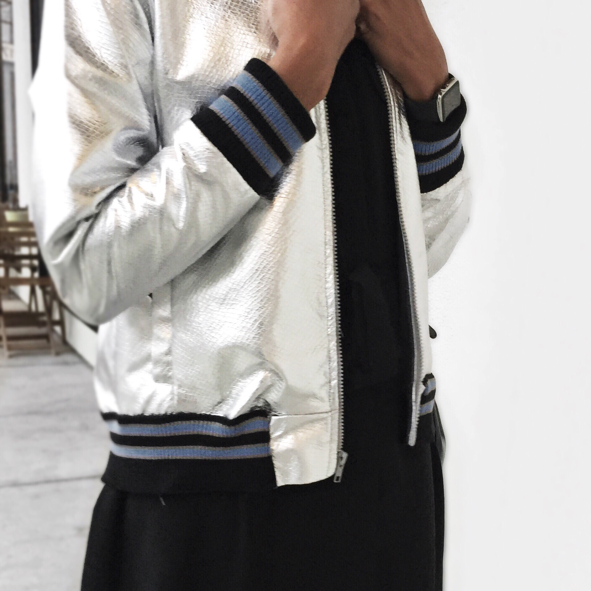 Released for the SS16 season, this bomber is classic meets sporty with a crinkled metallic finish guaranteed to make you stand out in the sea of other bomber clad fashion mavens.
